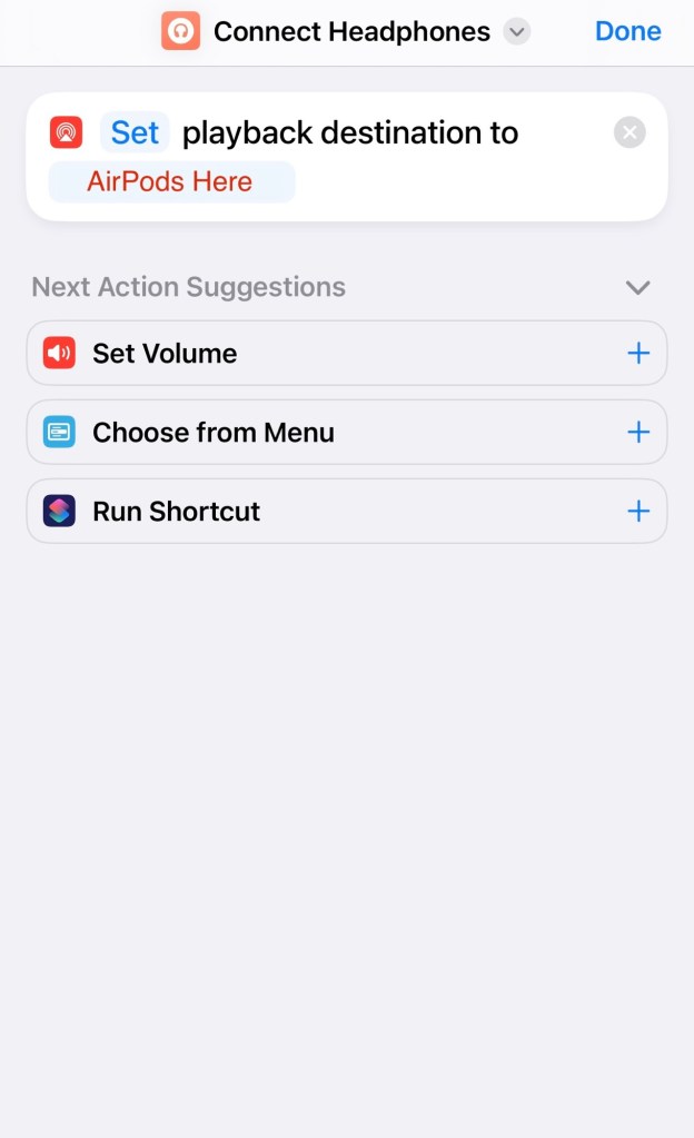 The shortcut is just one action called ‘Set Playback destination to’ and select the AirPods.