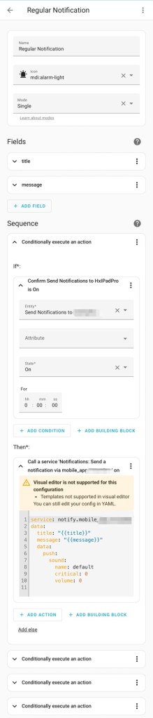 If an automation needs to send a notification, just calls the ‘regular_notification’ script with data parameters ‘title’ and ‘message’. if the device switch is on it will get the notifications.